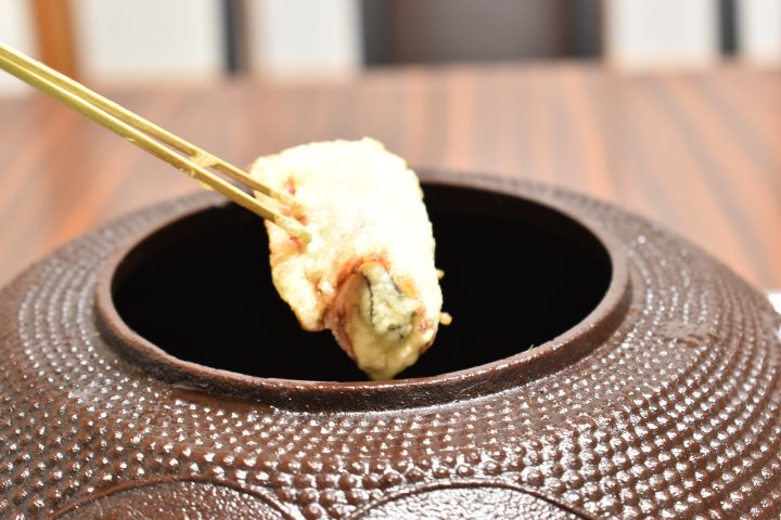 旬のものを揚げることができます。おしゃべりしながら、自分のペースで揚げれるので、熱々の天ぷらをいただけるのは嬉しいですね。天ぷらは、サムライネギを使った塩コショウ、ハーブソルト、練った梅、かぼす、天つゆとつけダレも豊富です。
