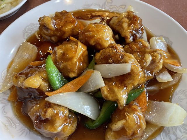 酢豚は、ごろごろと入ったお肉や野菜に、つやつやの「あん」がたっぷりと絡んでいます。「あん」のとろみも絶妙。甘酸っぱさが豚肉によく合います!