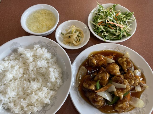 酢豚定食(900円)は、酢豚、ライス、サラダ、漬物、スープのセット。ボリューム満点の定食で、酢豚の甘酸っぱい香りが食欲をそそります。