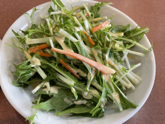 日によって替わるサラダ。この日はシャキシャキの水菜のサラダでした。野菜もしっかり摂れるのが嬉しいです。