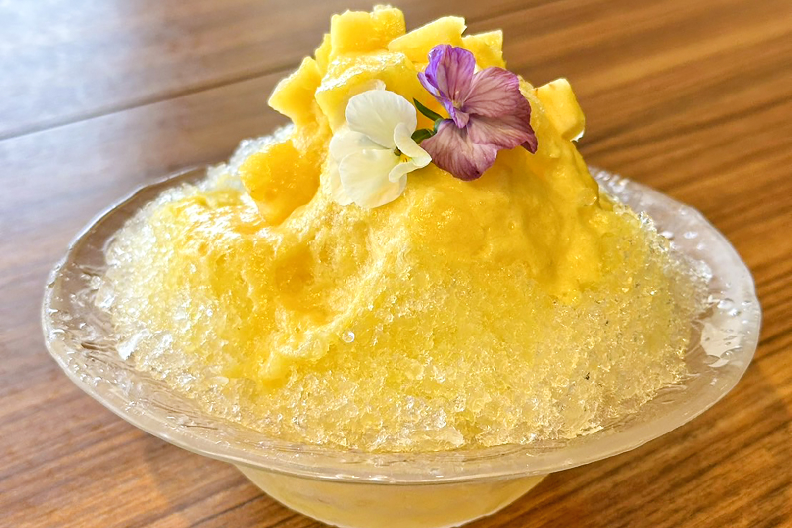 東広島のサンドイッチ専門店「フレスコサンドカフェ」では、果肉が入った「パイナップルのかき氷」(850円)が味わえます。シロップは毎日店内で手作り。かき氷には食べられる花がトッピングされています。八本松店・西条店の両店舗で提供。