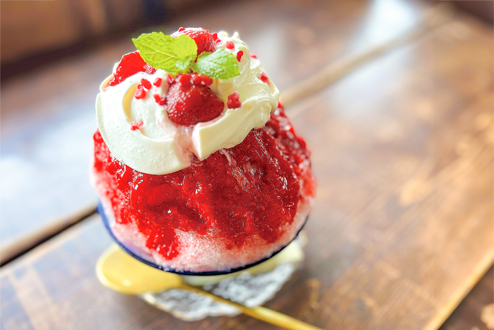 東広島市西条町御薗宇の「n cafe(エヌカフェ)」で一番人気のかき氷「いちごのふわふわカキ氷(1200円)」は、イチゴのシロップ漬けや果肉を使った自家製ソースなどがのっています。かき氷の中にはイチゴミルクまんじゅう入り。