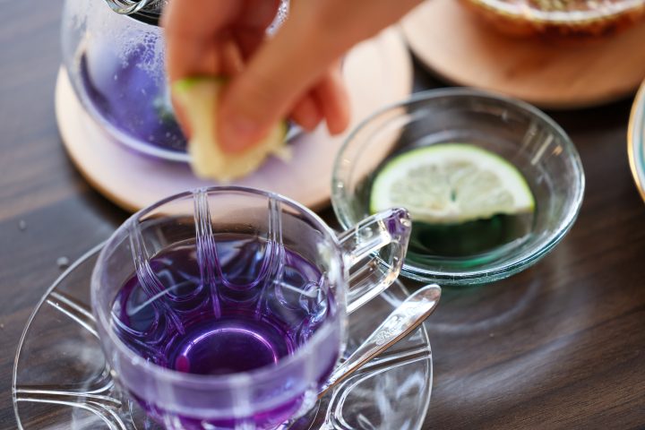 レモンを少し絞ると明るい紫色に変化し、色の変化を楽しむことができますよ。