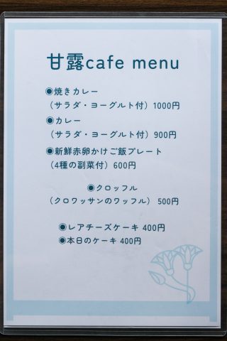 古民家「あい光」では甘露cafeやcafeらんぷ、自然派なちゅ〜るライフcaféの3店舗を曜日毎に営業しており、甘露cafeは金曜日と土曜日に営業しています。