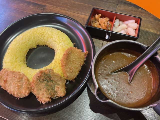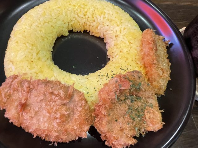 黒いお皿にドーナツ状に盛り付けられたターメリックライスは、創業当時から変わらないスタイル。ドーナツの穴に流し込むようにして、ルーをかけて食べます。
