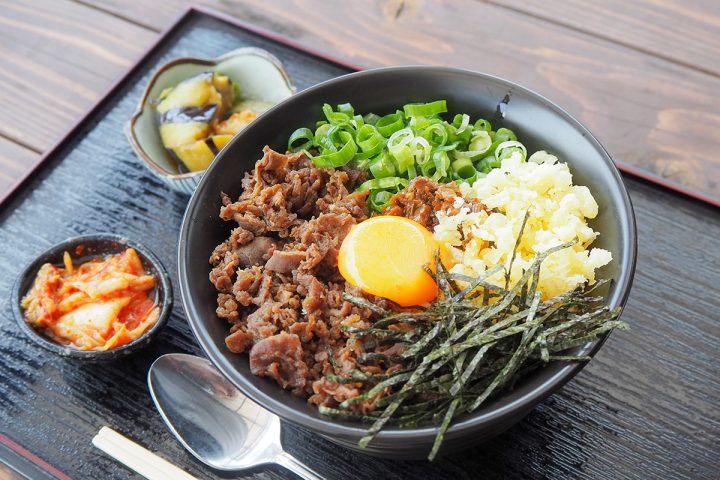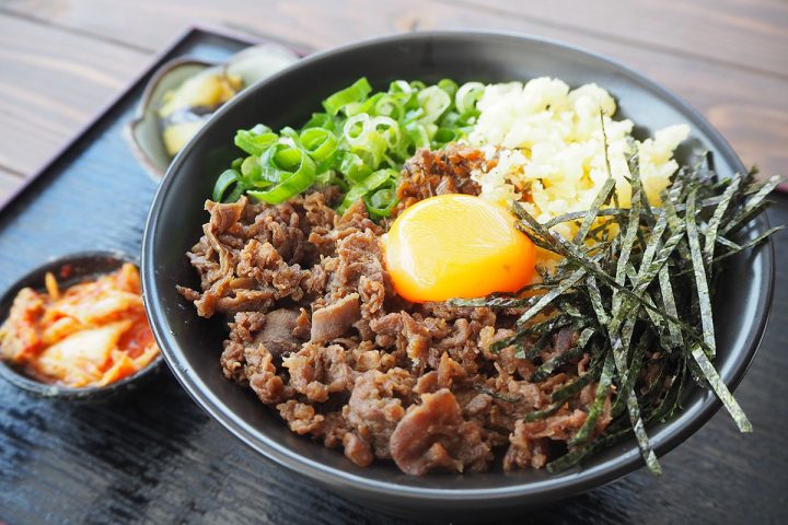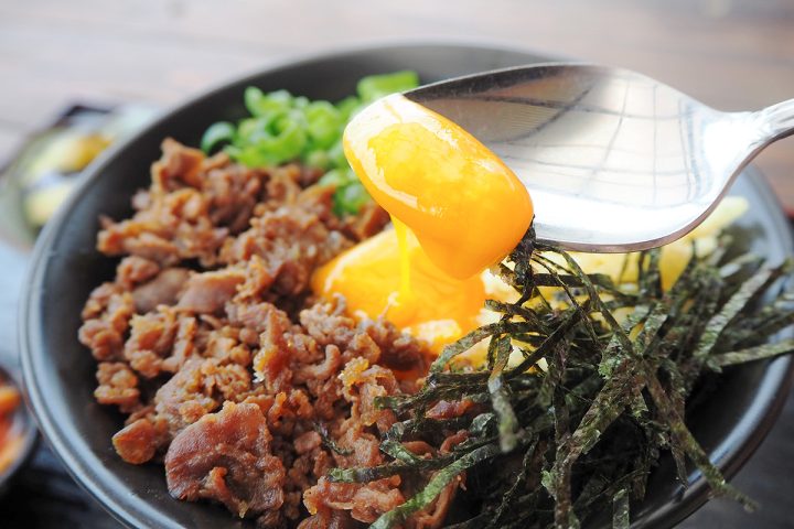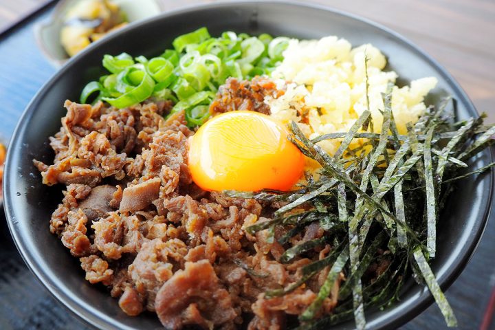 「広島へそ丼」は、広島県の真ん中にある豊栄町発祥のご当地丼。丼の真ん中に卵を落として「広島県の中央にある町」を表現しているそう。