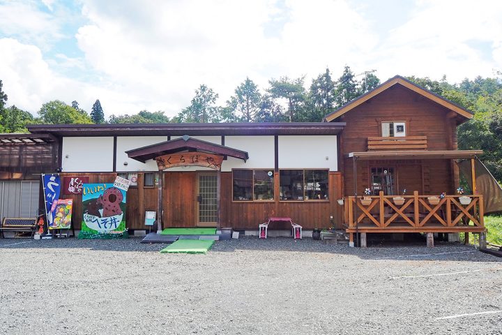 ログハウスのようなお店の外観。駐車場も広々としています。