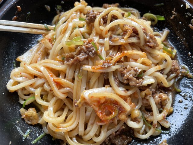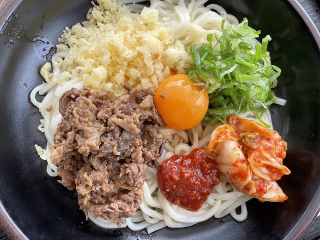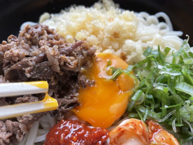 ごちゃ混ぜにすると、どんな味になるのかと思っていましたが、具が他の具を引き立たせているようで絶妙なバランス。牛肉の甘辛い味、キムチとコチ味噌のピリ辛の刺激、天かすのサクサクとネギのシャキシャキの食感、全部が卵でまろやかに麺に絡んで、このメリハリがクセになりそう。