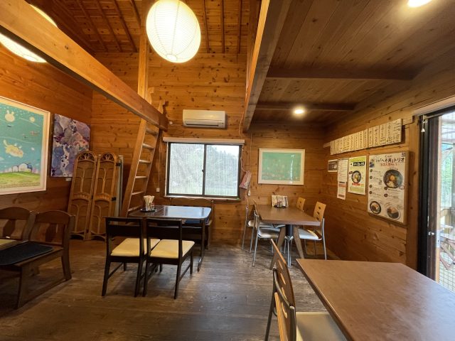 店内は木を使った内装で、木製のインテリアがあり、ログハウスのような雰囲気です。