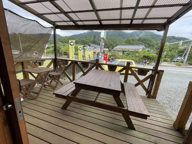 ウッドデッキにはペット同伴が可能なテラス席。春には桜がきれいに見えるそうですよ。秋も紅葉が美しい福富。もう少し涼しくなったら、ここでのんびりするのもおすすめです。