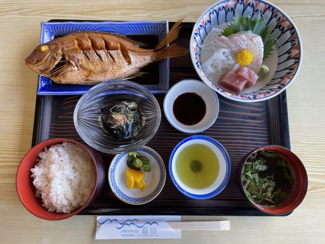 黒浜定食は、刺し身、魚の煮付け、小鉢、ご飯、汁物、漬け物のセット。魚はその日に仕入れた新鮮なものを提供しています。