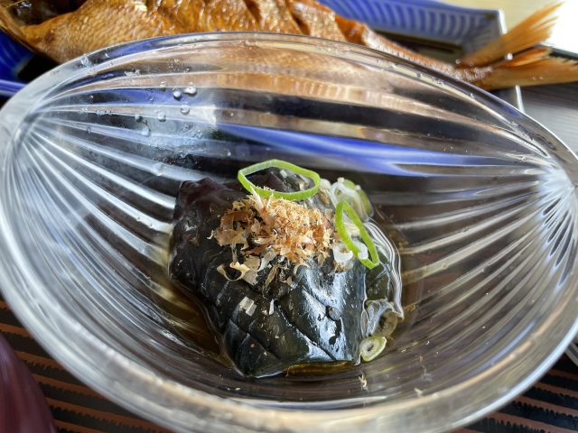 煮付けは、一尾丸ごとのタイ。お皿からはみ出ている迫力にびっくり! ツヤツヤの皮をまとったタイは、身がプリっとしていてジューシー。甘辛い味付けの煮汁がご飯とよく合います。