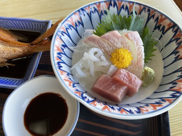 刺し身は3種類あり、この日は、タイ、イカ、マグロ。厚切りのタイとマグロは、プリプリの歯応え。しょうゆを付けずにわさびをのせて食べてみると、魚そのもののうまさと甘さが感じられます。しょうゆの代わりに塩を少しつけて食べるのもおすすめです。イカは、コリコリとした食感で、甘くて濃厚。すべておいしくいただきました!