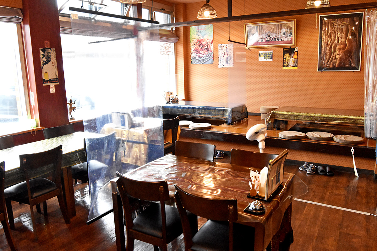 テーブル席や座敷、カウンター席がある店内。めずらしい置物やタイのポスターなどが飾られています。