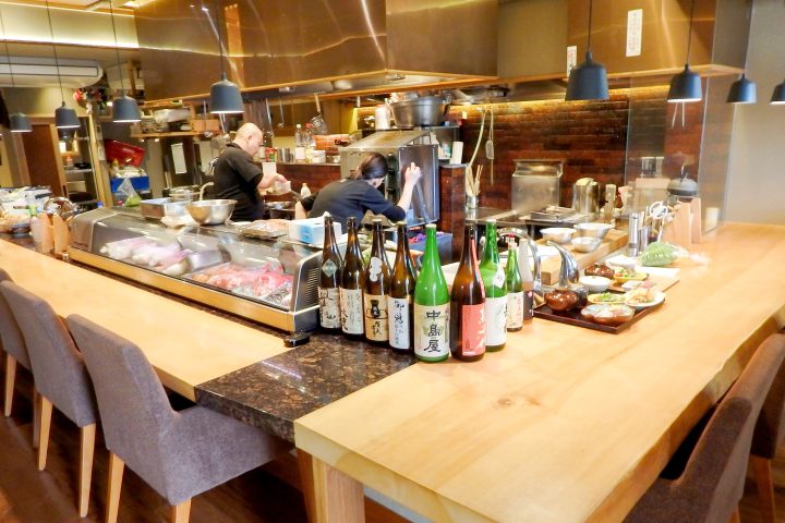 店内もベージュ基調で、L字形のカウンターに所狭しと清酒が並ぶ。その奥の厨房では、店主と、ととやから異動したスタッフがぴたっと息を合わせて調理をしていく。