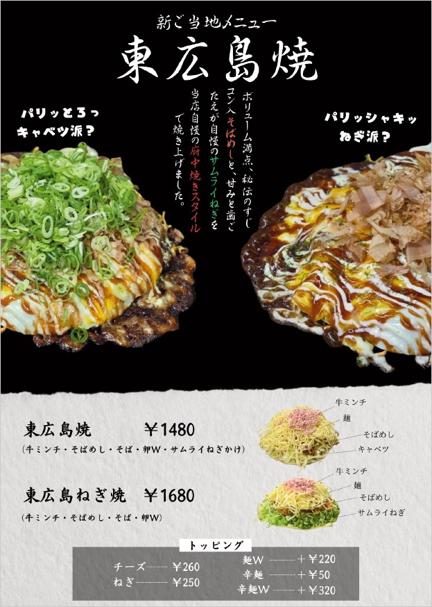 今回紹介した、おおにしの「東広島焼」と「東広島ねぎ焼」のメニューはこちら!