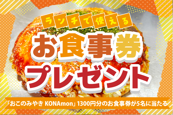 東広島市西条町寺家の「おこのみやき KONAmon(こなもん)」で使えるこなもんスペシャル(1300円)のお食事券を抽選で5名様にプレゼント!応募は2024年8月12日(月・祝)23:59まで!