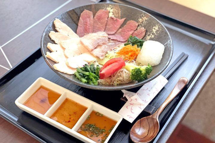 北海道産の牛肉と黒豚肉、国産の鶏肉、野菜が丼のごはんを埋めるように盛り付けられています。低温で調理したこだわりの肉を、そのまま食べたり、タレをつけたり、だしをかけたりする3段階の食べ方で、異なる食感とうま味を味わいつくすメニューです。