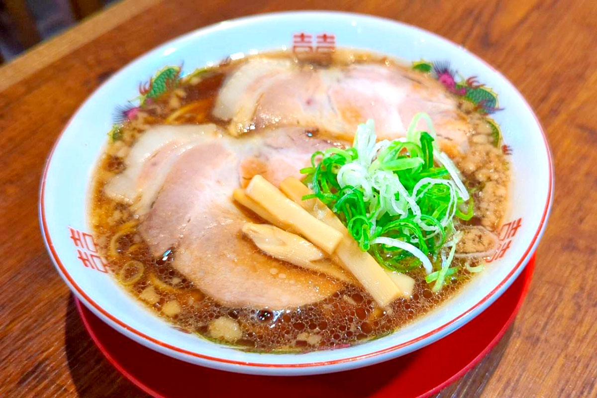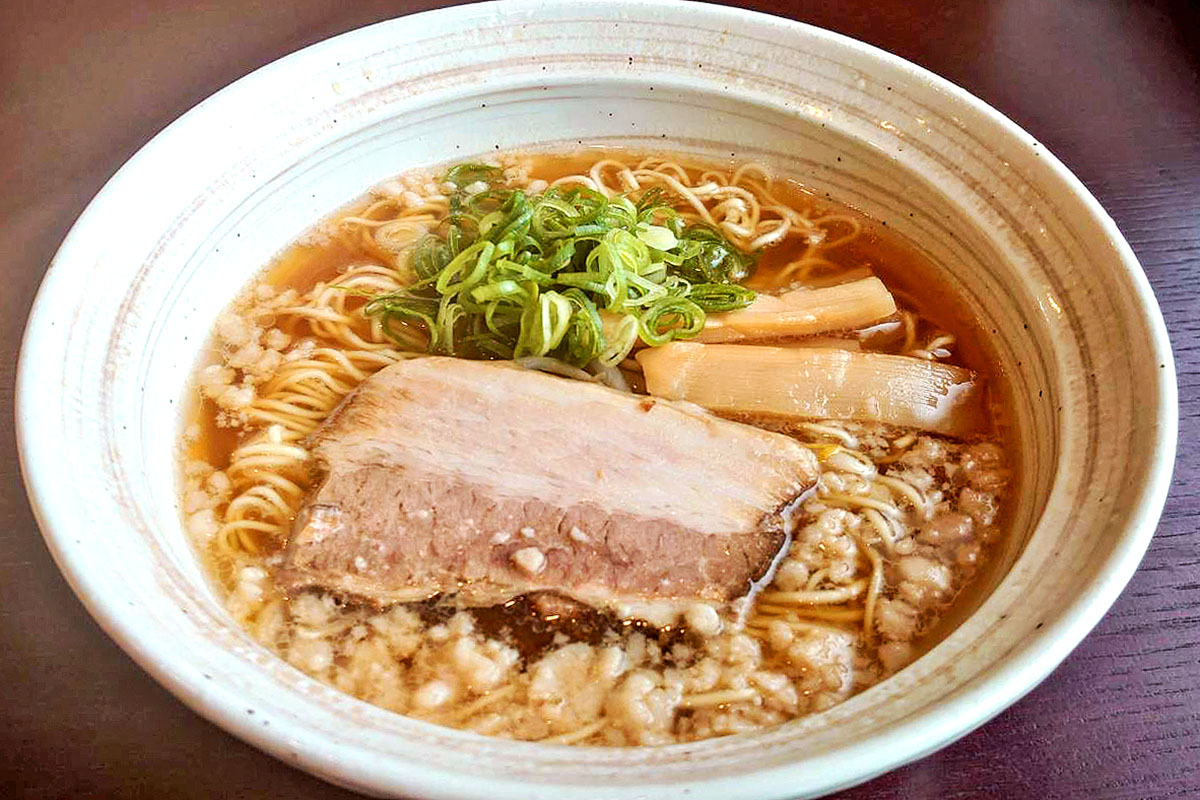 東広島市西条中央の「尾道中華そば くらげ」では、昔ながらの尾道ラーメンが食べられます。90年前から伝わる牛骨を使った味わいのある醤油スープや、プリプリ食感の大きな背脂、たっぷりのチャーシューが特徴的です。ネギは、東広島市志和町の新鮮なサムライネギを使用しています。
