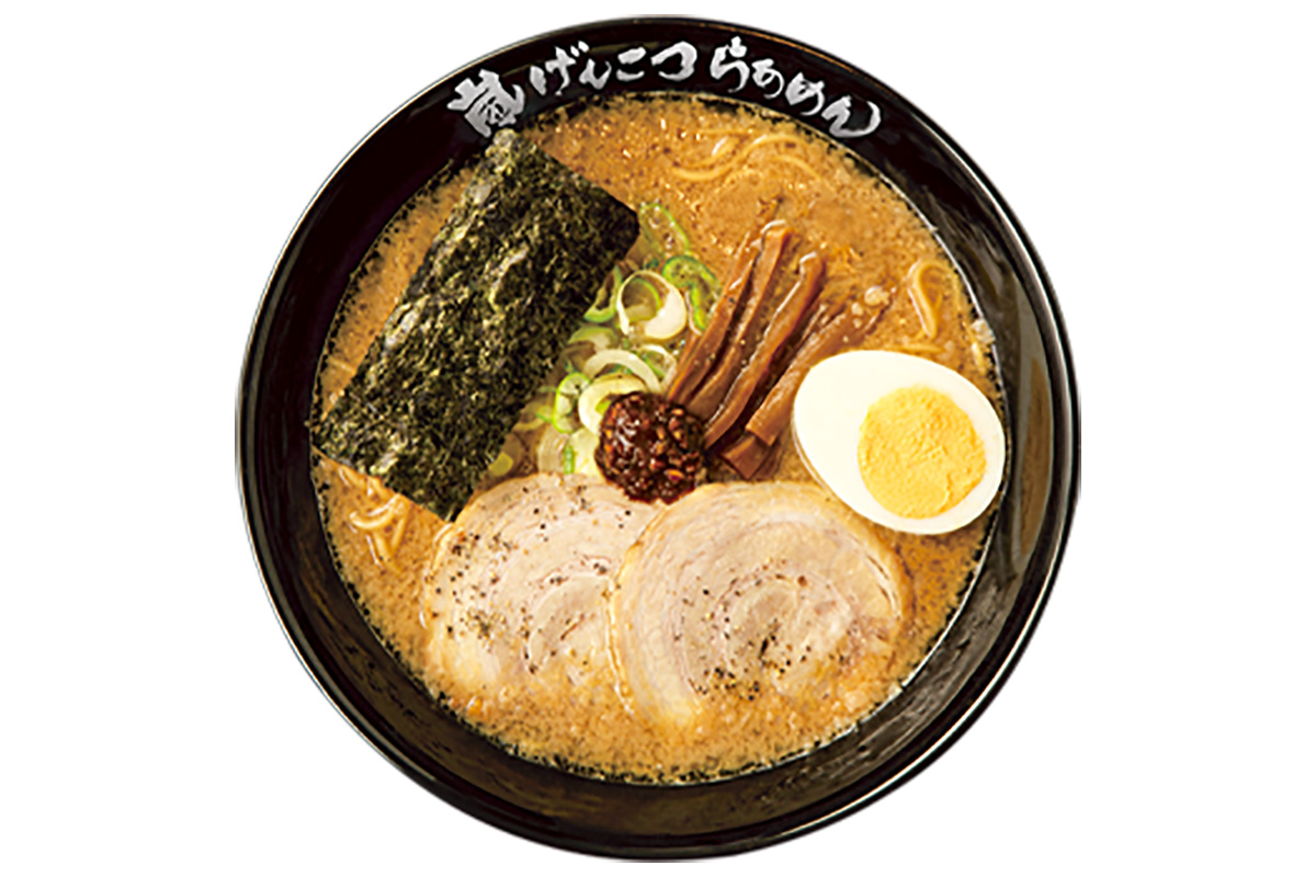 東広島市西条大坪町の「らあめん花月嵐 東広島西条店」は、豚骨ベースの背油醤油ラーメンや、期間限定のラーメンなどが味わえるラーメン店。人気の「嵐げんこつらぁめんしょうゆ」は、熟成された秘伝のたれが味の決め手の一杯。