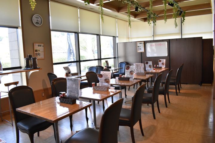 店内はテーブル席と、三ツ城古墳を眺めながら食べることができるカウンター席があります。