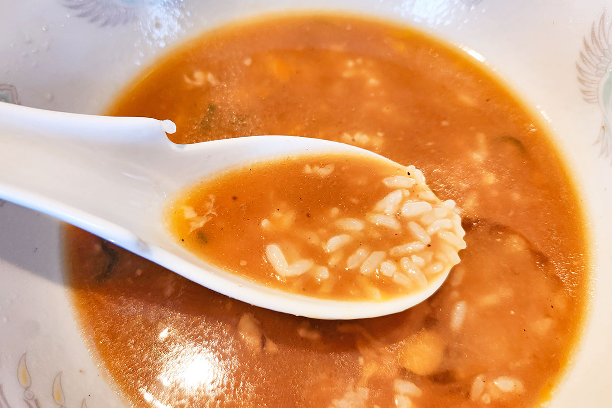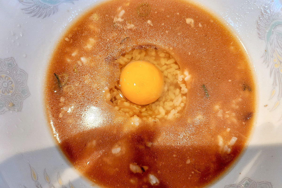 そして食後のお楽しみ。究極のTKG(卵かけご飯)です。お米も東広島産を使用。残ったスープにご飯と「東広島こい地鶏」の生卵をそのまま入れてかき混ぜます。