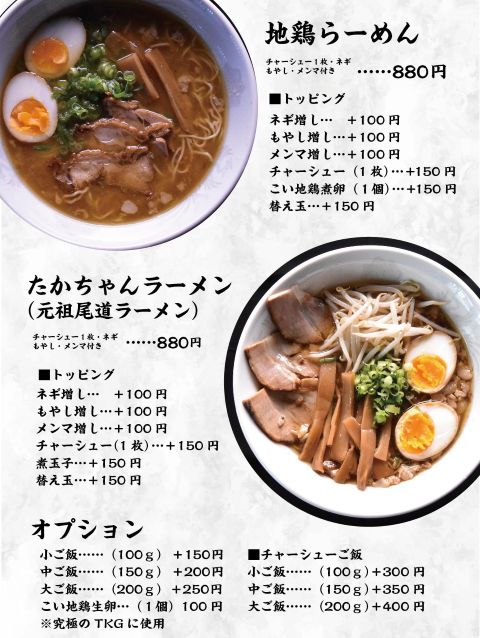 メニューの尾道ラーメン(たかちゃんラーメン)は「夢王国」で提供していた、岡本さん考案のラーメンとのこと。