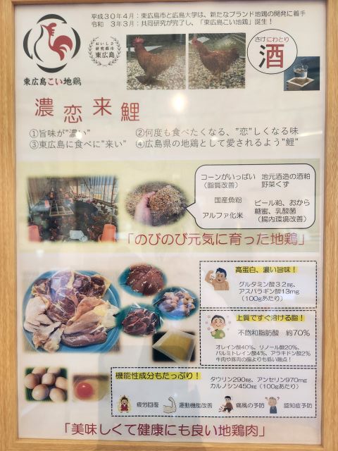 店内には「東広島こい地鶏」のことが説明されたパネルも。読んでみると、栄養価が高いエサを食べてのびのび育ったからこそ、栄養価が高い鶏肉なんだと分かりました。