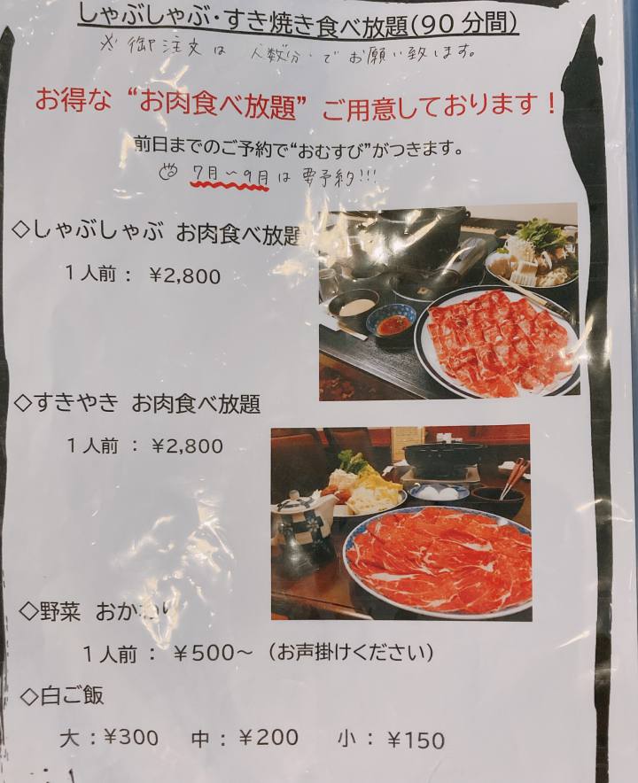 すき焼きやしゃぶしゃぶの食べ放題も気になりますね。(前日までの予約が必要)