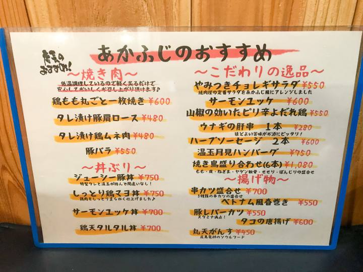 ひらがなであかふじと書いてある赤い富士山のマークのお店です。汁なし坦担麺くにまつの黄色い看板も。
