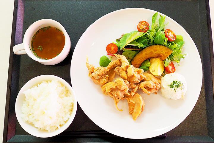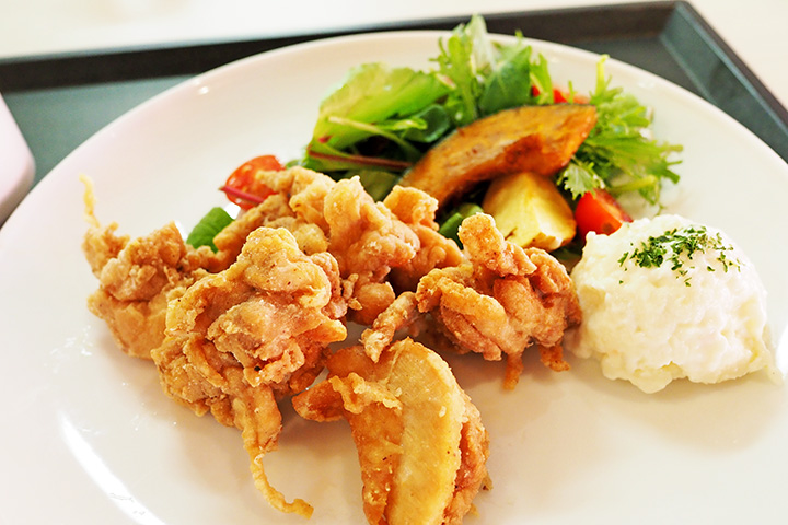 野菜は基本的に、東広島の地元食材を使用。季節によって種類も変わるそうです。唐揚げランチは野菜もしっかりとることができるので、女性にも嬉しいセットだと思いました。