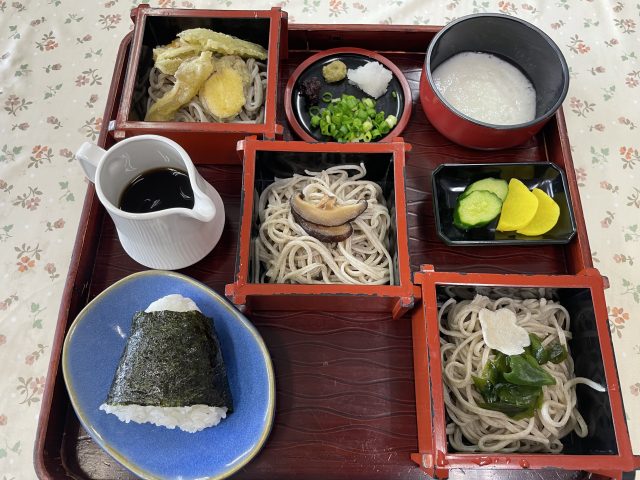 地元産の打ちたてのそば、野菜、米を使用した人気のメニュー。3段のそば皿には、地元野菜の天ぷら、シイタケ、わかめがそれぞれ盛り付けられています。そばの食べ方はお好みで、そばつゆ、山芋、薬味で楽しめます。