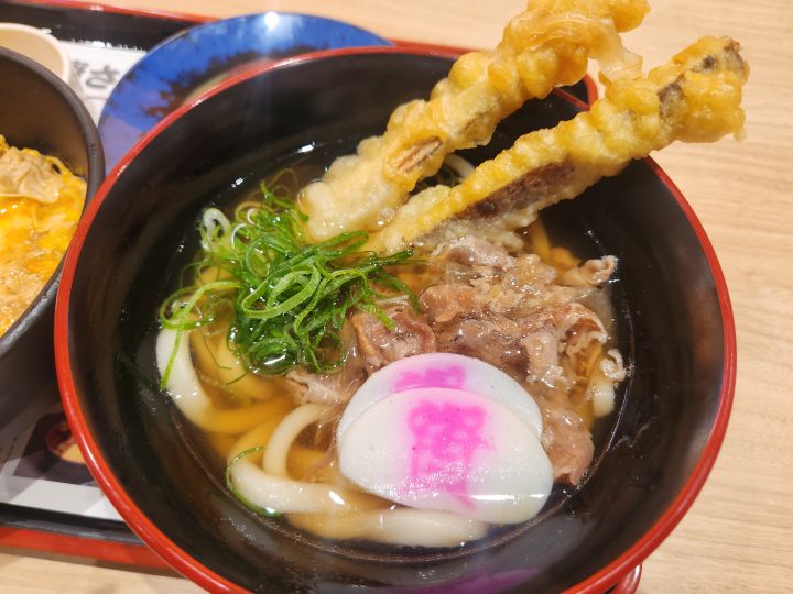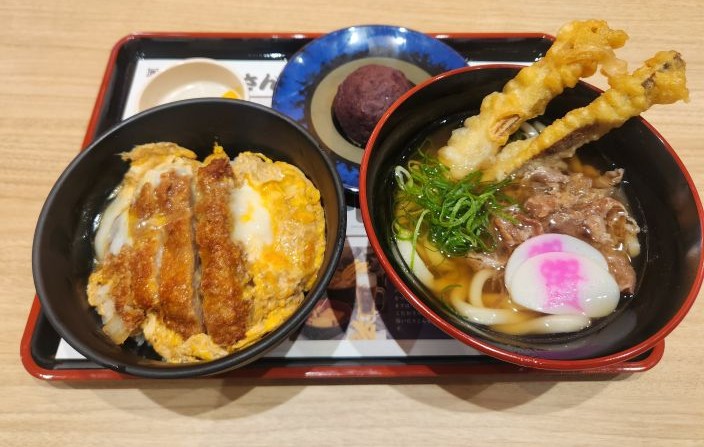 私は資さんうどんで人気の肉ごぼ天うどんとカツとじ丼をチョイスしました。