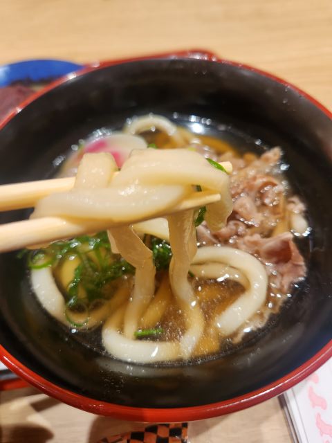 うどんの麺は口当たりは柔らかく、もちもちとした食感。広報スタッフの伊藤さんによると、やわらかめと固めのちょうど間くらいの食感にして、食べ応えも出るように作っているそう。ゆで時間だけでなく、その製法にもこだわりがあるとのこと。麺にもだしと甘辛く煮た牛肉と玉ねぎの味がしっかりと染み込んでいました。