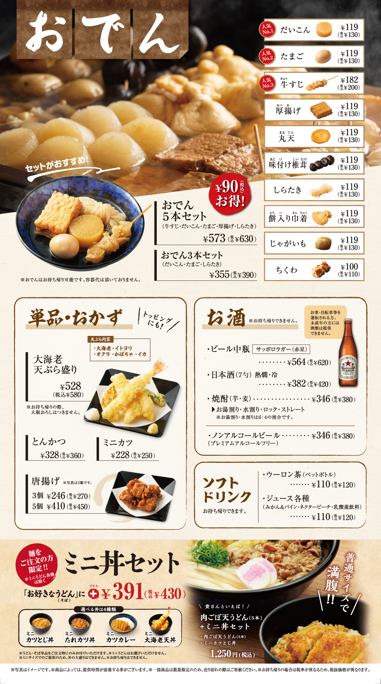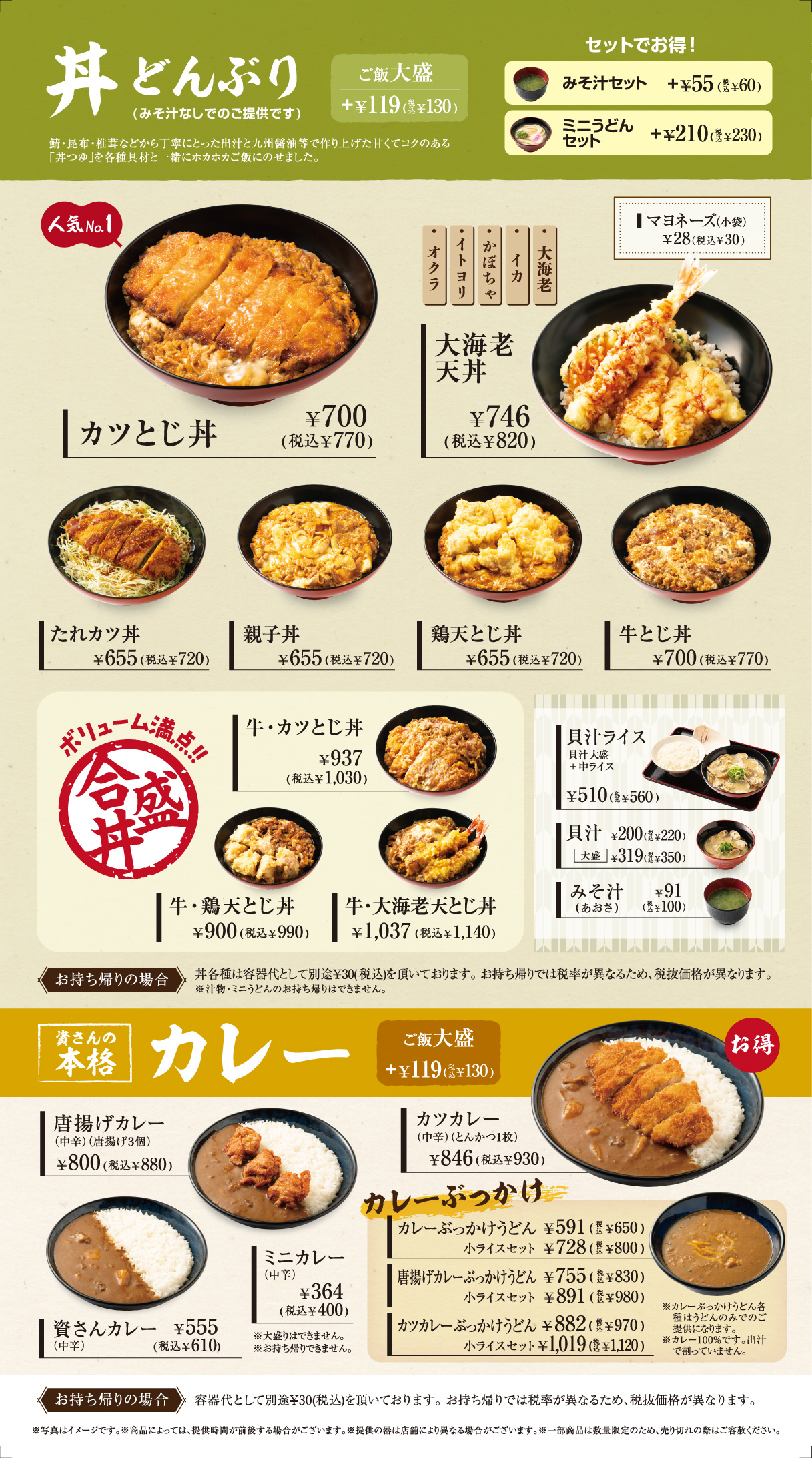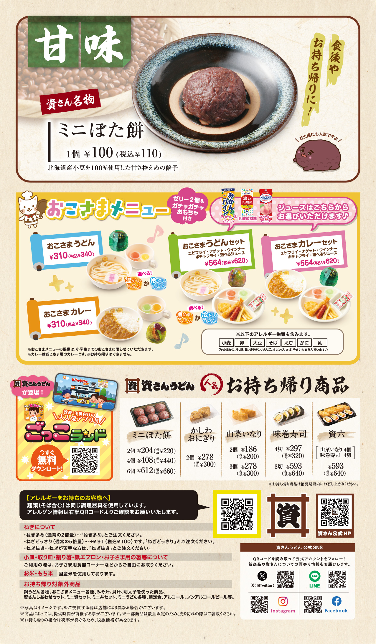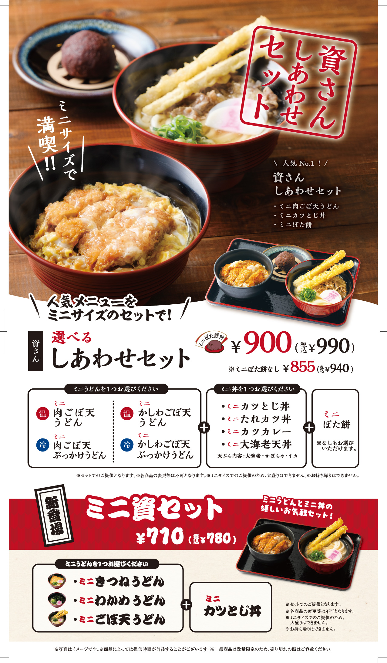 スタッフおすすめの「資さんしあわせセット」(990円)は、全てミニサイズの、うどん、丼、ぼた餅がセットになったメニュー。うどんと丼は自分でメニューを選ぶことができます。