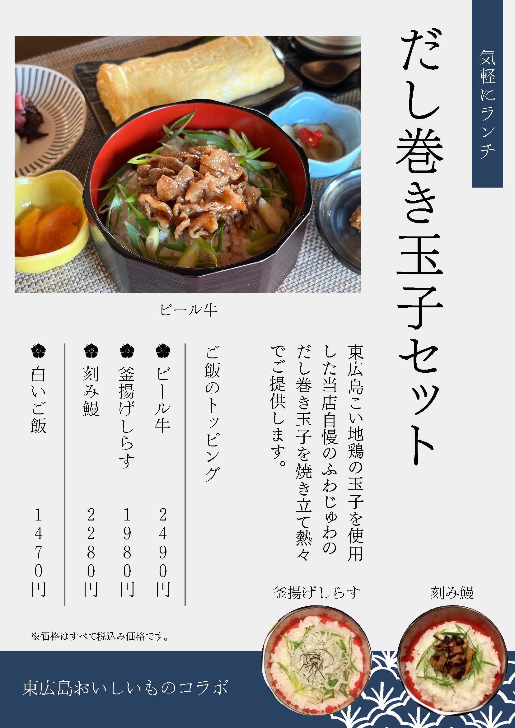 東広島市黒瀬町丸山のウナギ専門店「勝梅園」では、東広島こい地鶏の卵を使っただし巻き卵のランチを提供しています。ご飯に広島ビール牛をトッピングしたセットメニューがおすすめです。