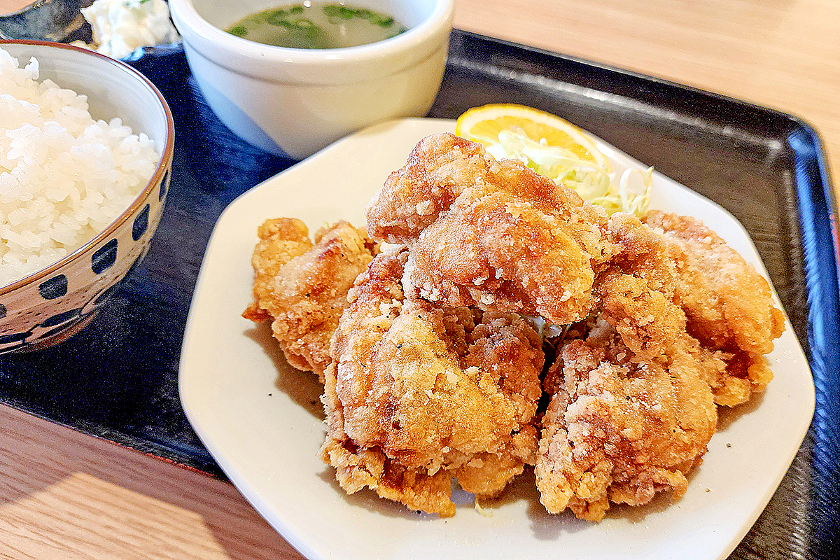 人気のランチメニューの「唐揚げ定食」は、唐揚げ、キャベツとスパゲティの付け合わせ、漬け物、小鉢、みそ汁、ごはんのセット。唐揚げは一つ一つが大きくボリューム満点。外はカリッと香ばしく、中からは肉汁がじゅわっとあふれるおいしさです。