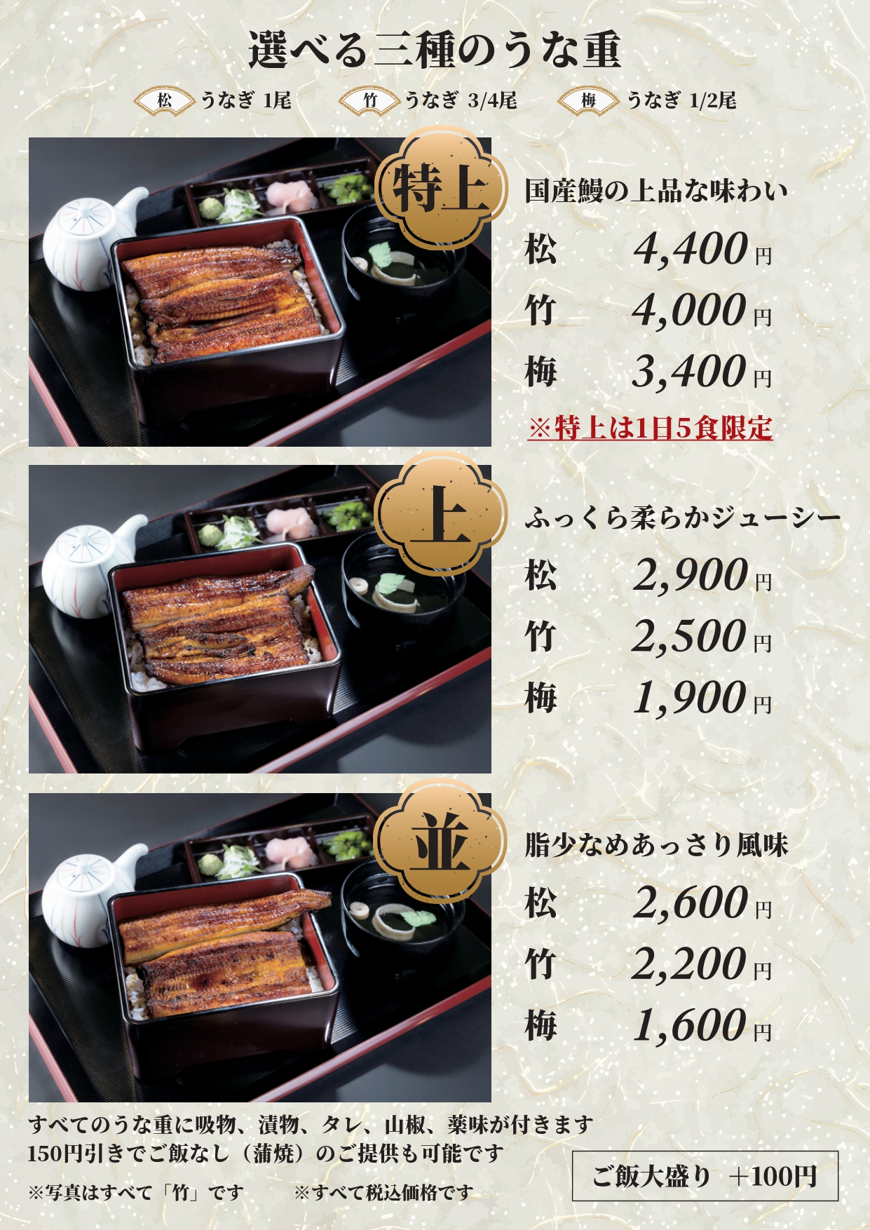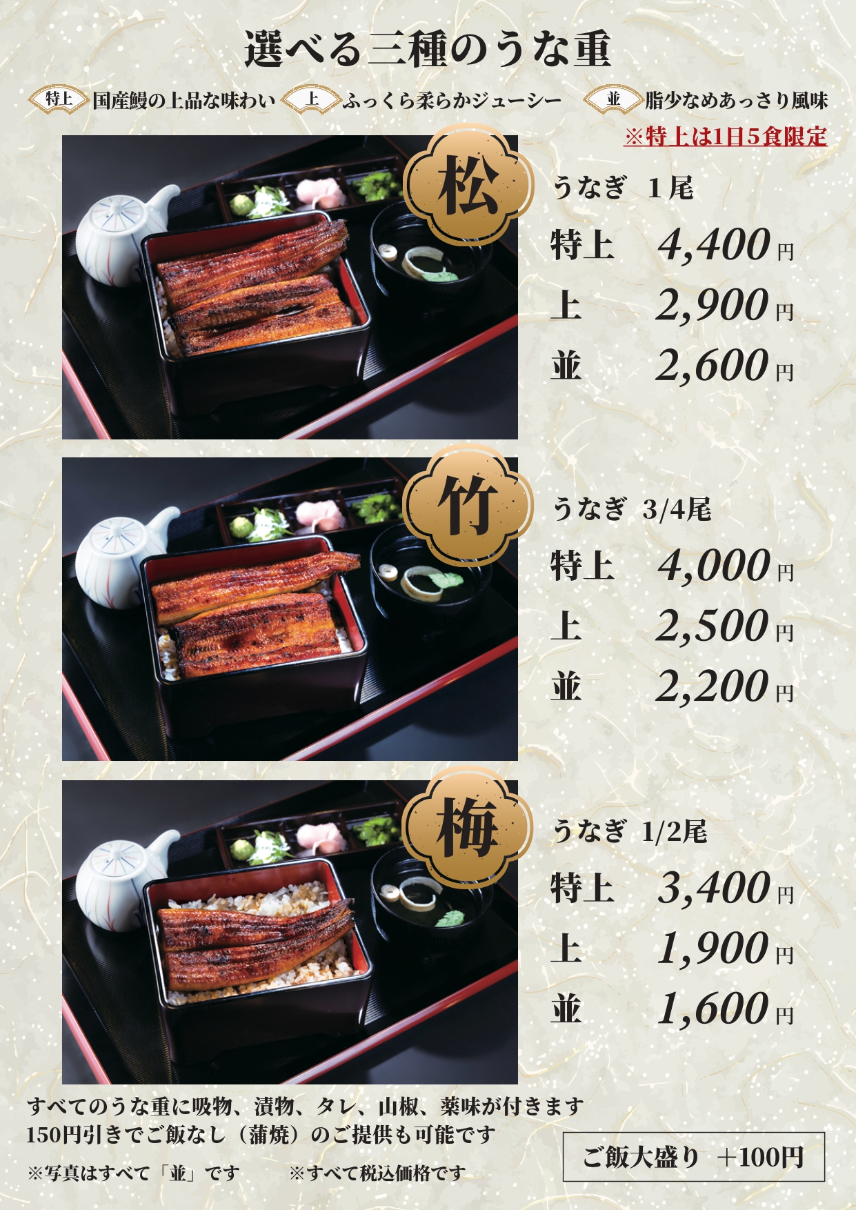 鰻の成瀬 東広島西条店のメニューはうな重のみ。1600円から楽しめ、鰻の質(特上・上・並)と量(松・竹・梅)を組み合わせてカスタマイズができます。たとえば、「今日はちょっとぜいたくしたい!」という日は、“特上×松”の豪華なうな重で自分へのごほうびにもぴったり。100円を追加してご飯を大盛りに変更することもできます。
