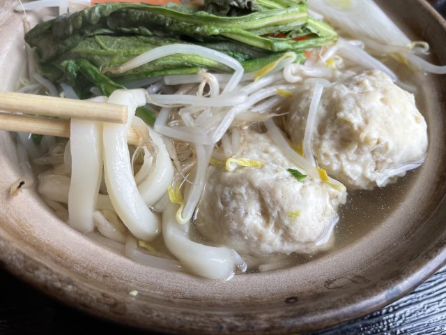 手作りの鶏だんごは、ショウガの味がきいていて、やわらかい食感の中に、コリコリした食べ応えを感じました。なんこつが入っているそうです。