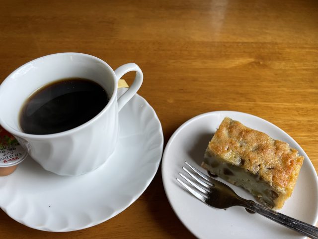 日替わり定食は、食後にデザートとコーヒーが付いています。デザートも何が出るかは当日のお楽しみです。この日は、甘さ控えめな和テイストのケーキでした。