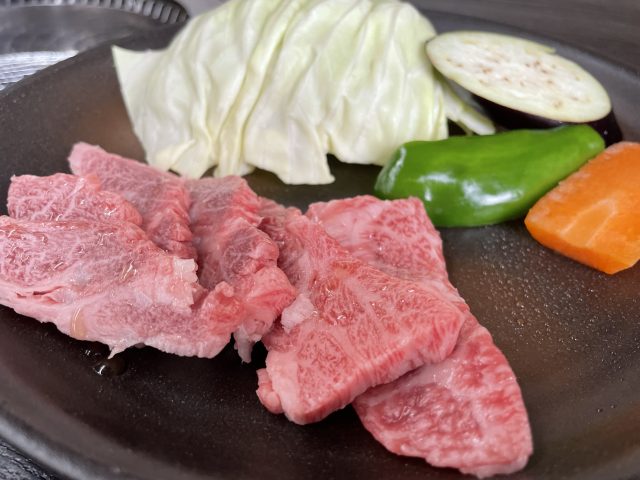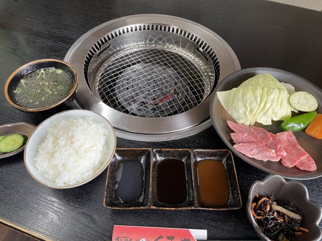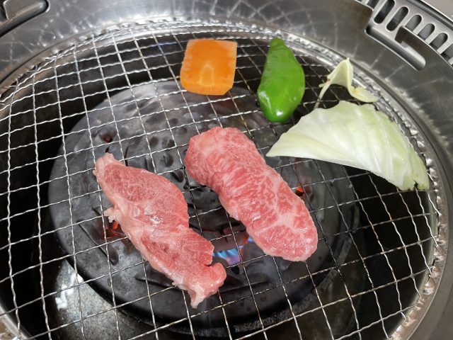 野菜は、ピーマン、キャベツ、ニンジン、ナス。自分で焼きながら食べるひとり焼肉がランチで楽しめるメニューです。