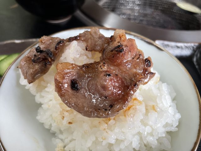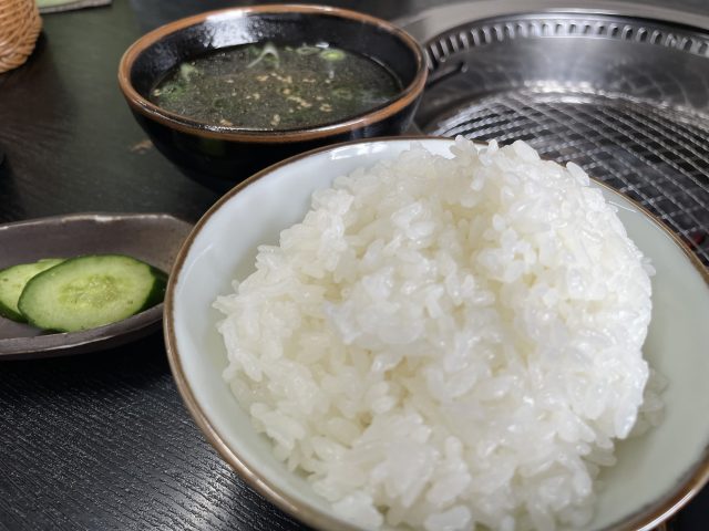 やわらかくて、おいしい〜。焼くだけのシンプルなメニューだからこそ、お肉のおいしさが際立ちます。たれをつけてごはんにのせて食べるのもおすすめ。ごはんは、大・中・小から選べます。これは、「中」。