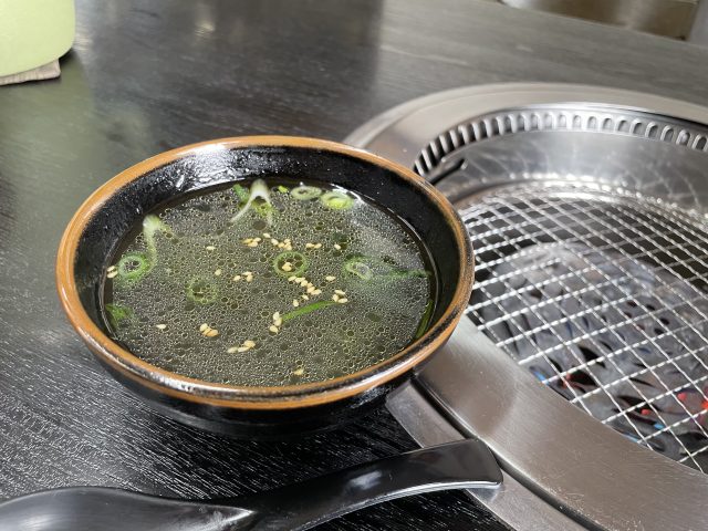 汁物は通常、みそ汁がつくそうです。この日はなんと完売で、わかめスープでした。お肉ともごはんとも相性が良く、コクがある「焼肉屋さんのわかめスープ」です。単品でも注文できます。