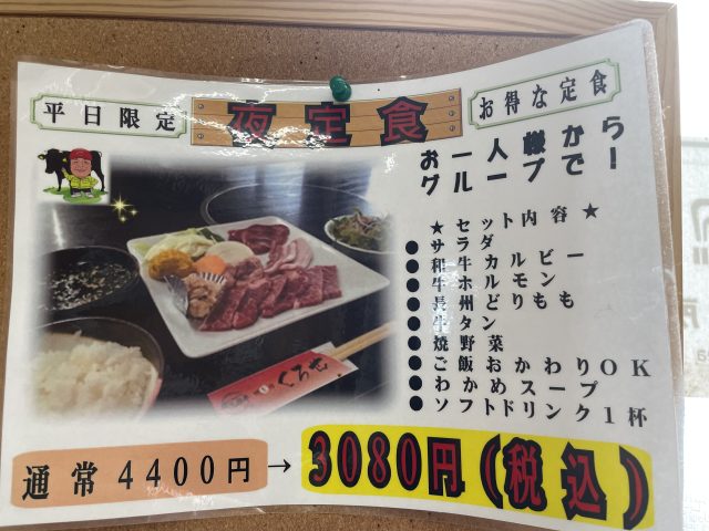 お仕事帰りなどには、平日限定の「夜定食」がおすすめです。サラダ、和牛カルビー、牛ホルモン、長州どりもも、牛タン、焼野菜、わかめスープ、ご飯(おかわりOK)、ソフトドリンクも一杯付いて3080円(通常4400円)と、満足のセット内容。おひとりでも、グループでも注文できます。