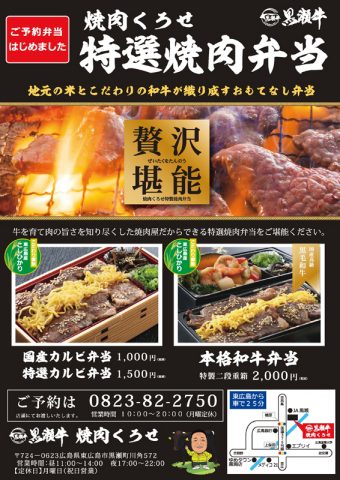 焼肉くろせで提供している地元のお米とこだわりの和牛はテイクアウトでも味わえます。焼肉屋さんの特選焼肉弁当は全4種類で、おみやげにもおすすめです。