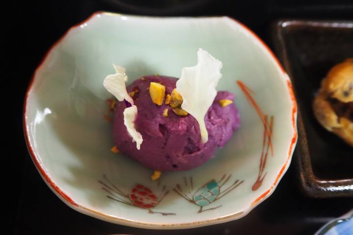 紫芋のピュレは、入っているピスタチオの歯応えがよくすごく美味しかったです。