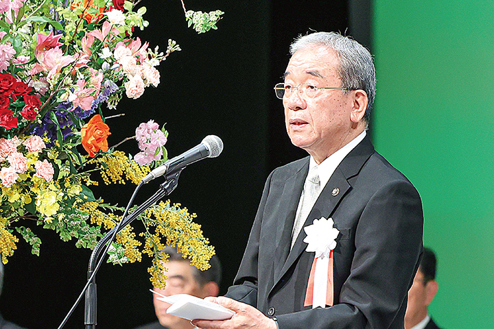 東広島市は市制施行50周年を迎えた4月20日、記念式典を東広島芸術文化ホールくらら(同市西条栄町)で開き、招待者や市民ら約800人が出席して節目の年を祝った。