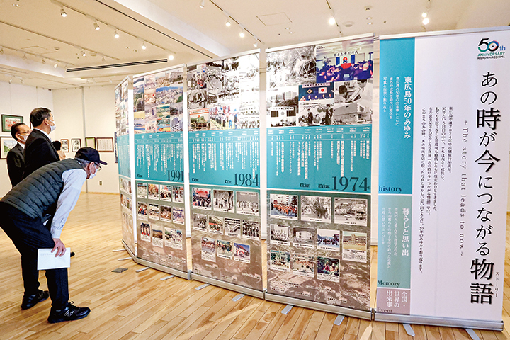 式典で高垣広徳市長は「50年後の未来に向けた次世代学園都市として歩みを進める元年とし、先人が培った歴史と伝統をさらなる発展と飛躍の未来へとつなげていきたい」とあいさつ。第1部では、広島県出身の時川英之監督が制作した記念映像「東広島市50年の夢」を上映。同市出身でエリザベト音楽大の折河宏治准教授が、東広島市くららジュニアオーケストラの伴奏で市歌の未公開の3番を独唱した。