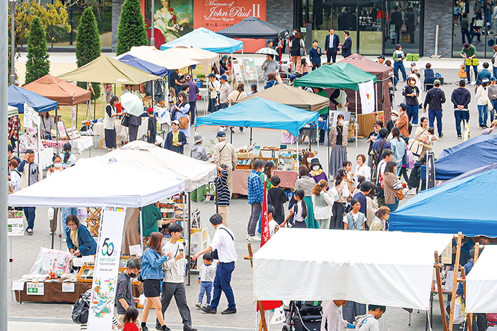 くららでは「あの時が今につながる物語」の記念写真展を市民ギャラリーで、文化活動団体20チームが出演した「カルチャーフェスタ2024」を小ホールなどで同時開催。西条中央公園では記念マルシェが開かれ多くの人でにぎわった。(山北、撮影・大矢)
