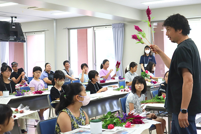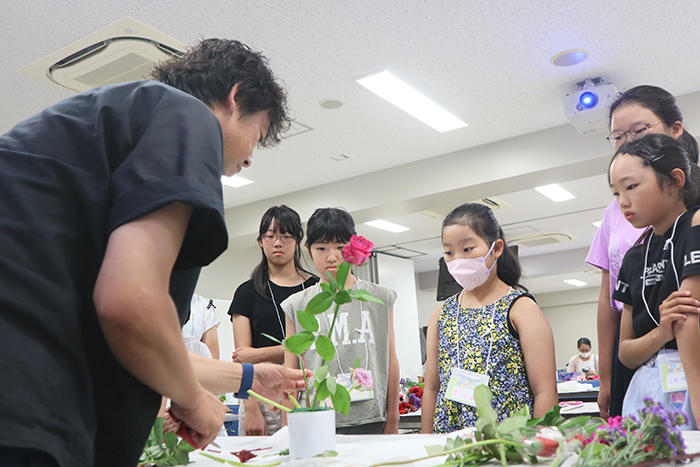 児童らにアレンジメントのポイントを説明する舛川社長(左)(撮影・山北)